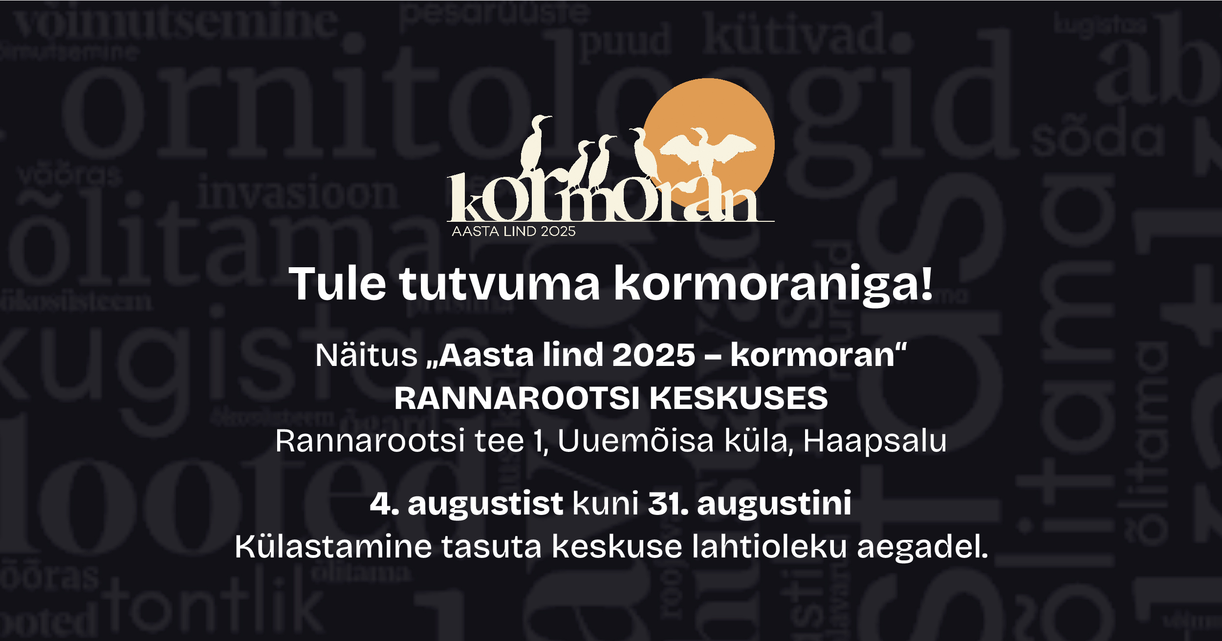 Rändnäitus “Aasta lind 2025 – kormoran” on Rannarootsi Keskuse fuajees avatud 4. augustist kuni 31. augustini. Külastamine tasuta, maja lahtiolekuaegadel.