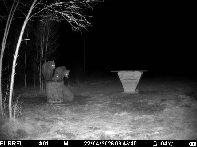 22. aprilli öösel salvestas Põltsamaa külje all Mõrtsi külas rajakaamera huvitava seiga, kus neli noort karu on toiduootel.